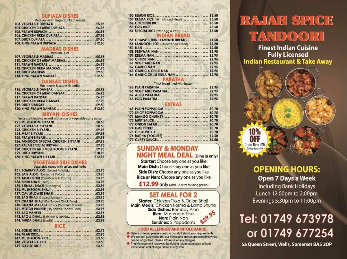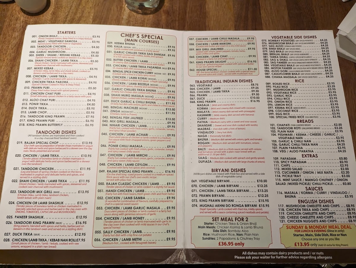 You can expect a range of comforting mains like the Rajah Classic Lamb or Butter Chicken, alongside more adventurous picks such as Duck Garlic Chilli Bhuna and Lamb Tikka starters. A choice of fragrant rice dishes—from Coconut Rice to the subtly spiced Keema Rice—complements these mains beautifully, while freshly baked plain or vegetable parathas add a satisfying, chewy contrast.